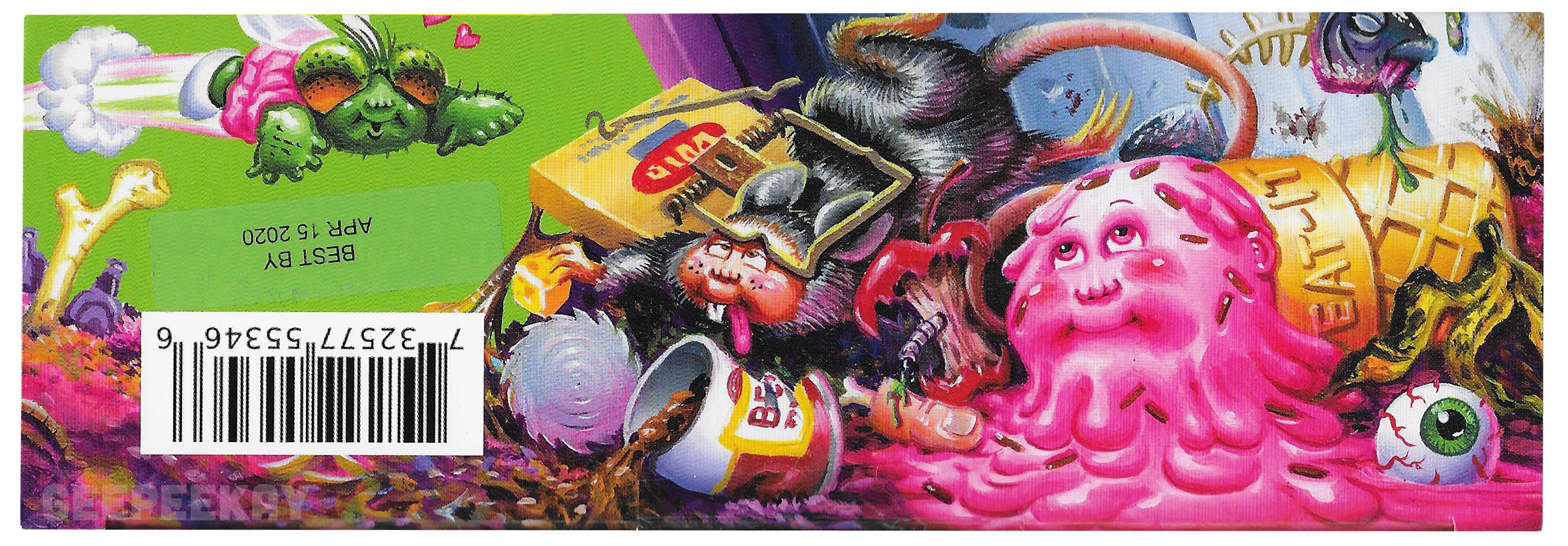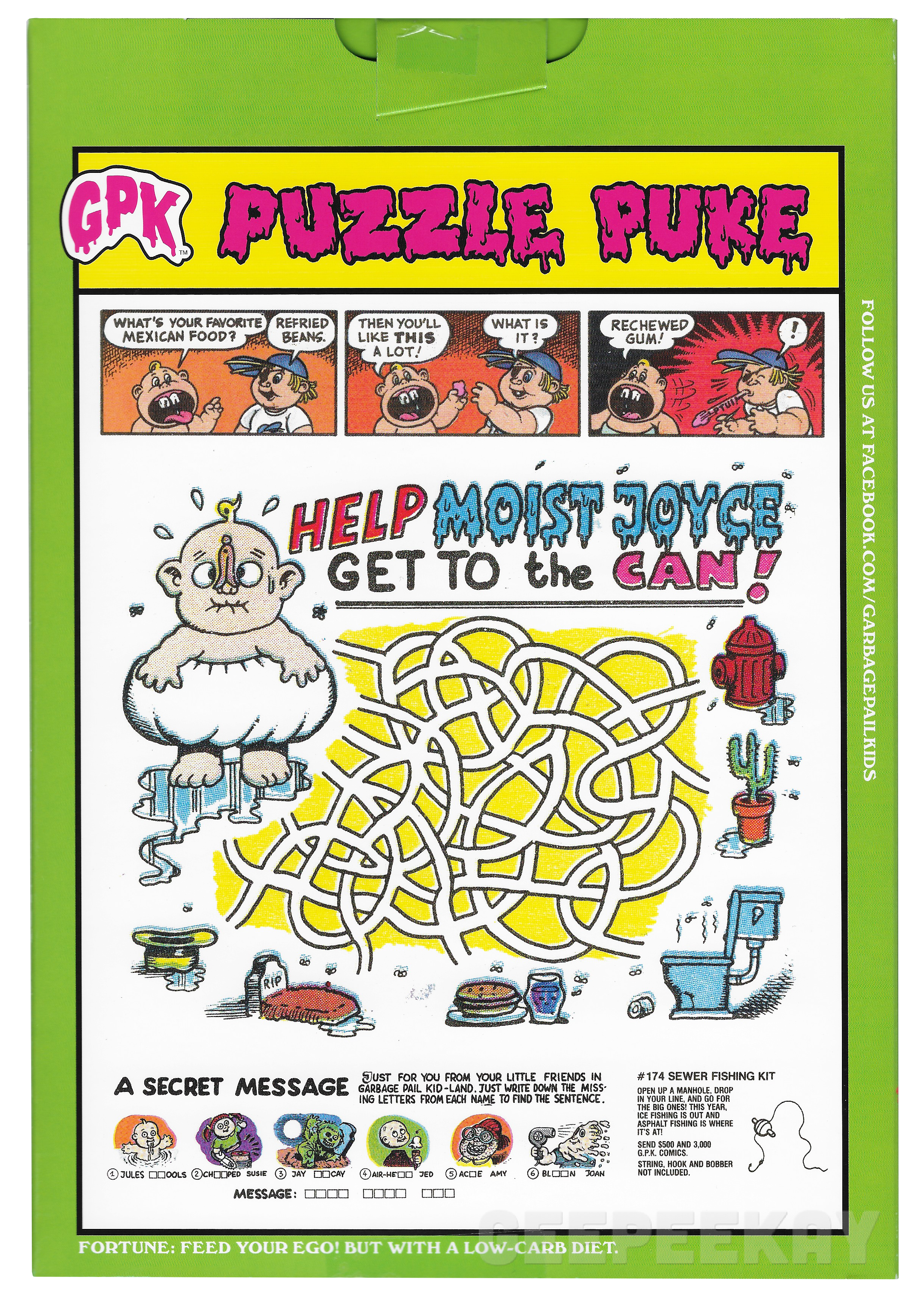 There were a total of four different trading cards inserted into the large cereal boxes (above), and all featured new artwork from Joe Simko. The cards contained puzzle backs that could be assembled to form a small puzzle depicting the front of the cereal box. Below is a gallery of the FYE x GPK trading cards: