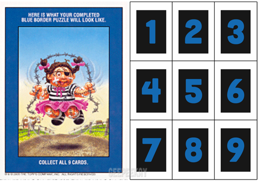 The completed Blue Border Puzzle from All New Series 4 (above) is shown on the back of cards 6b Impaled Dale, 25b High Man Dan. To complete the Blue Border Puzzle you will need the following nine cards: