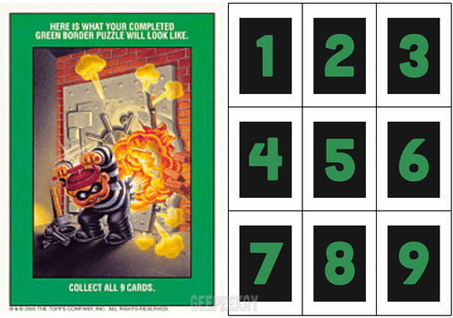 The completed Green Border Puzzle from All New Series 4 (above) is shown on the back of cards 5b Swingin' Sierra, 34b Acne Andy. To complete the Green Border Puzzle you will need the following nine cards: