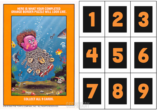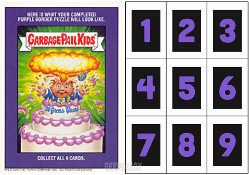 The completed Purple Border Puzzle from All New Series 4 (above) is shown on the back of cards 13a Fallen Angel, 35a Floodgate Nate. To complete the Purple Border Puzzle you will need the following nine cards: