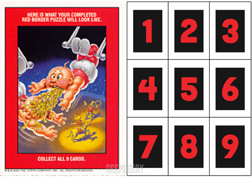 The completed Red Border Puzzle from All New Series 4 (above) is shown on the back of cards 15a Jumpin' Jen, 28b Gassin' Grant. To complete the Red Border Puzzle you will need the following nine cards: