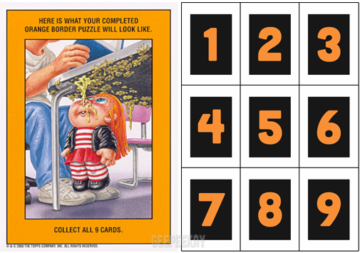 The completed Orange Border Puzzle from All New Series 7 (above) is shown on the back of card 48b Licked Vic. To complete the Orange Border Puzzle you will need the following nine cards: