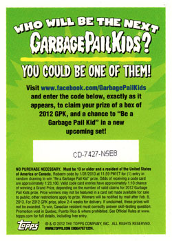 If a collector was lucky enough to pull this card they were able to redeem the card for a box of free Topps product and a chance to be one of five grand prize winners who would have a future GPK character named after them and drawn in their like-ness for a future set.