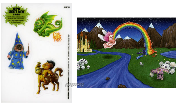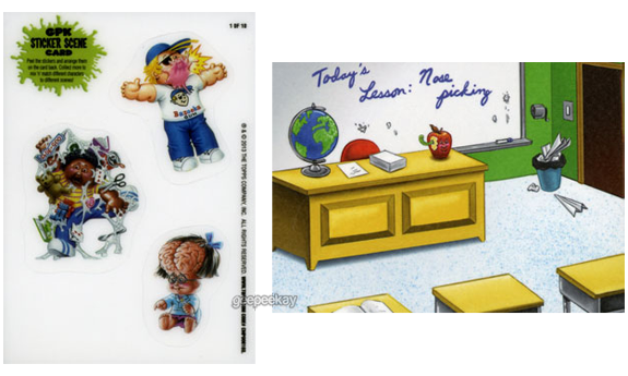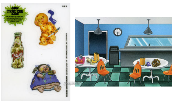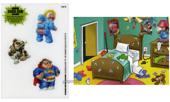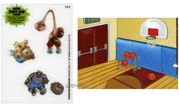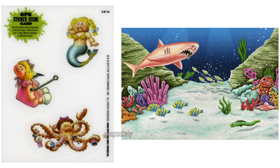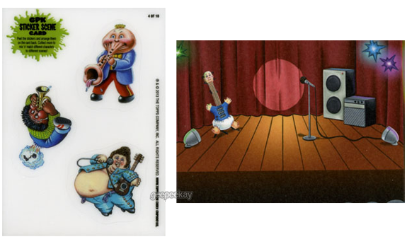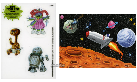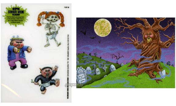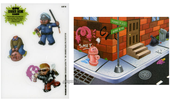 INFORMATION: The Sticker Scenes contain three transparent GPK characters on the front of the card that can be removed and placed in different 'scenes' that are on the back of the card. The Gallery above includes the front (left) and back (right) of all 10 stickers. Collectors could find these cards in 1:6 packs