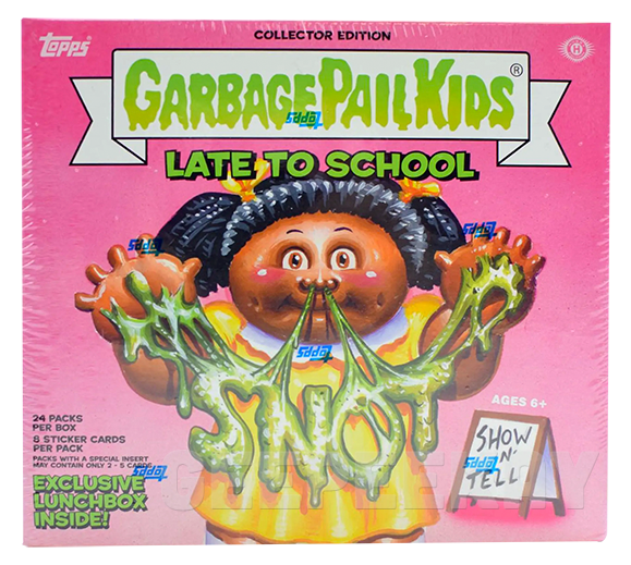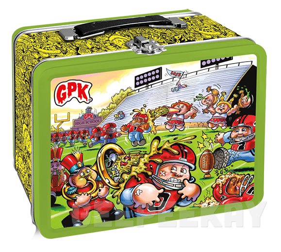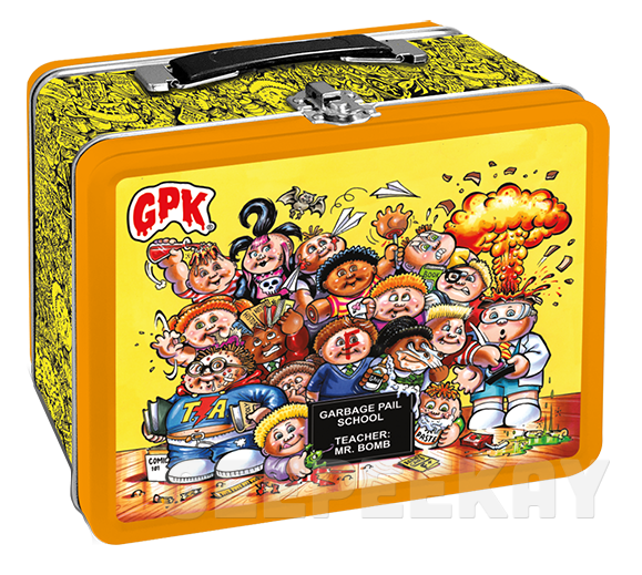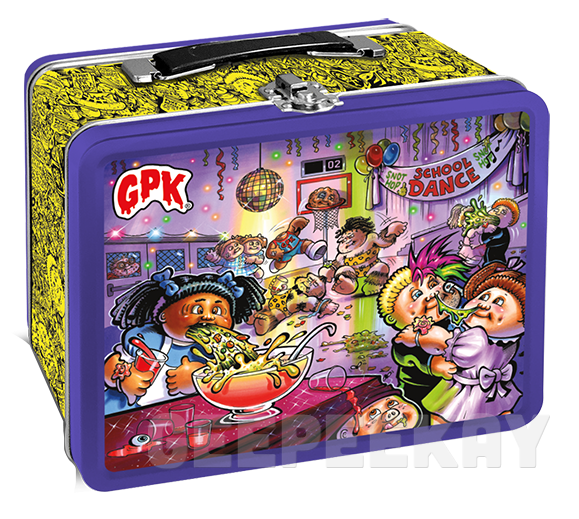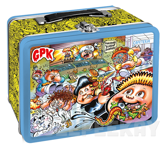 INFORMATION: For the Late To School release Topps created entirely new packaging for the Collector's Edition boxes: miniature GPK lunchboxes. Made of metal (yet slightly smaller in scale), these lunchboxes strongly resembled original lunchboxes from the 80s. All artwork for the lunchboxes was completed by Joe Simko, and they were available 1 per Collector's Edition box