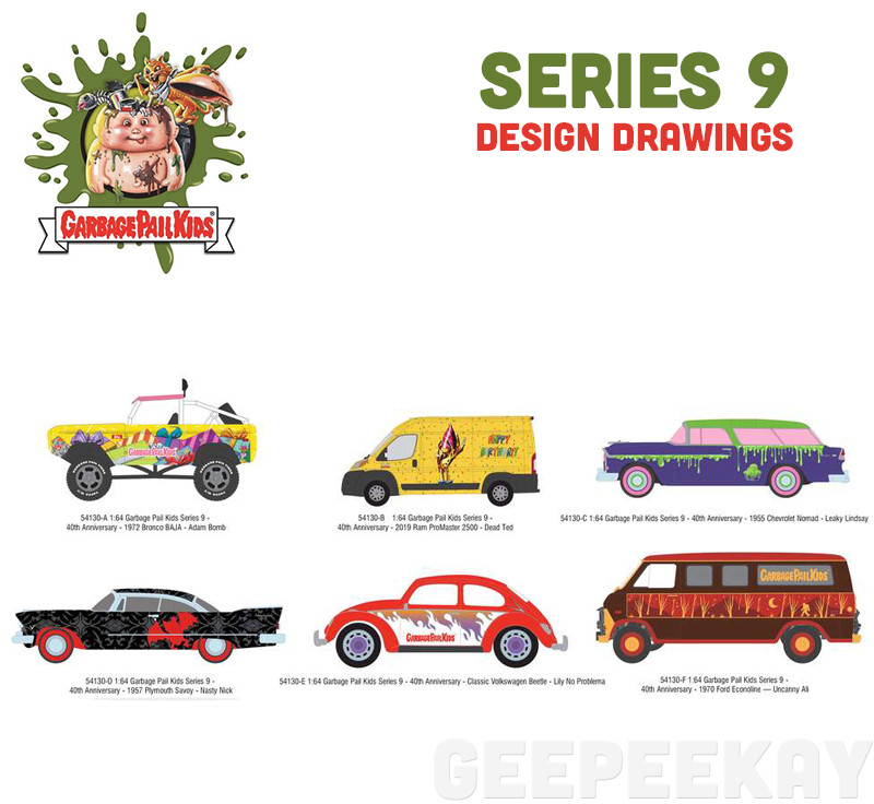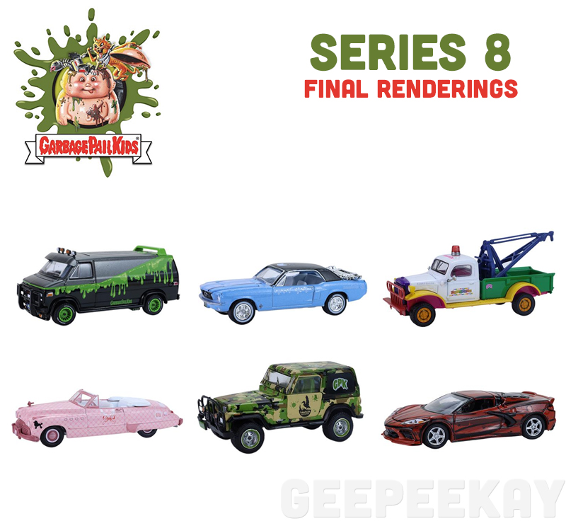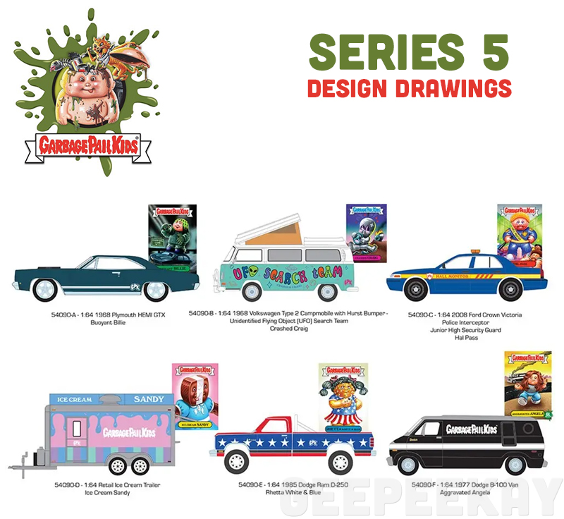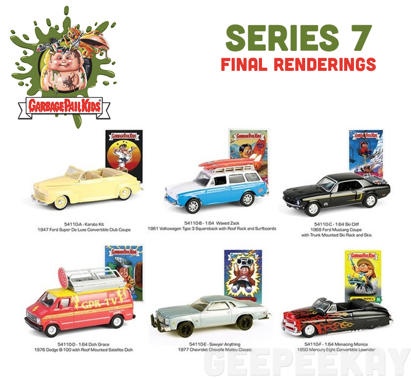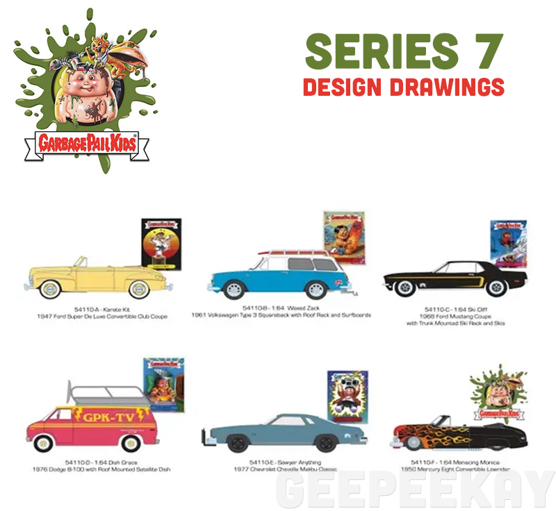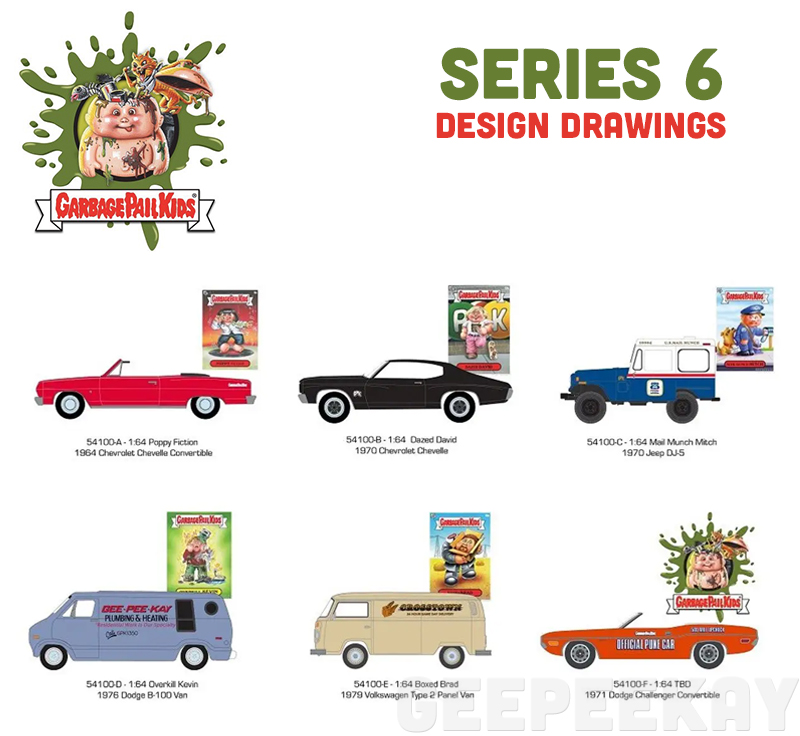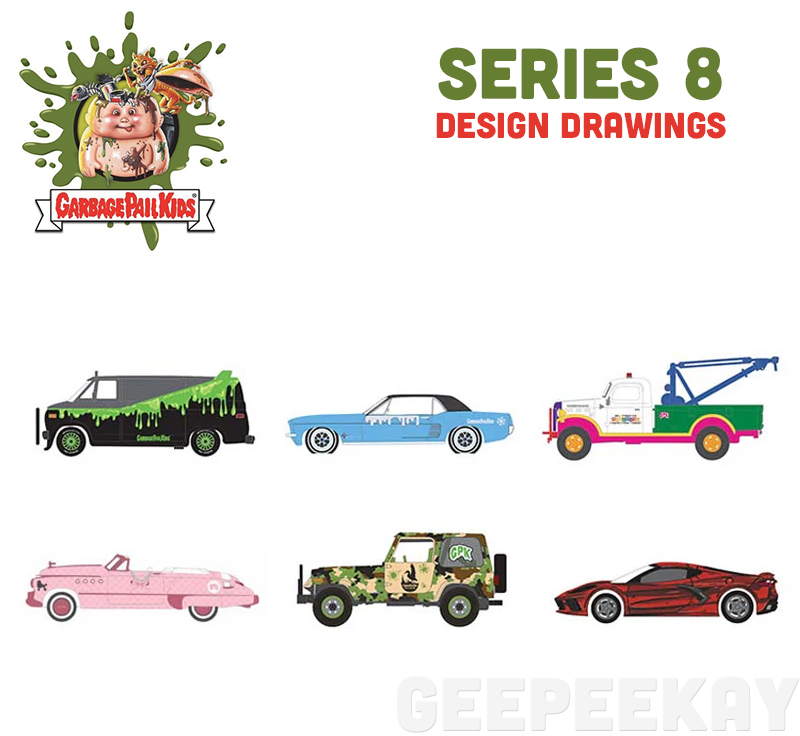 GreenLight shares detailed flat artwork for each series prior to their eventual release. These images are not fully-rendered final artwork, rather rough images designed to share the color patterns and overall design of the cars (and often a peek at the Garbage Pail Kids card accompanying each car)