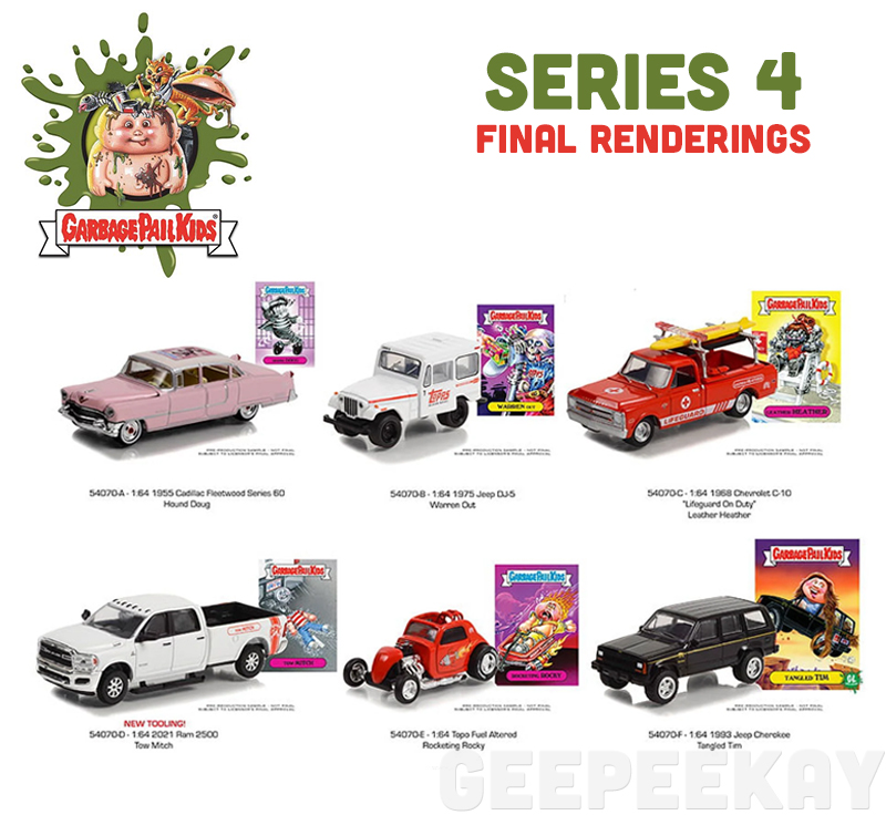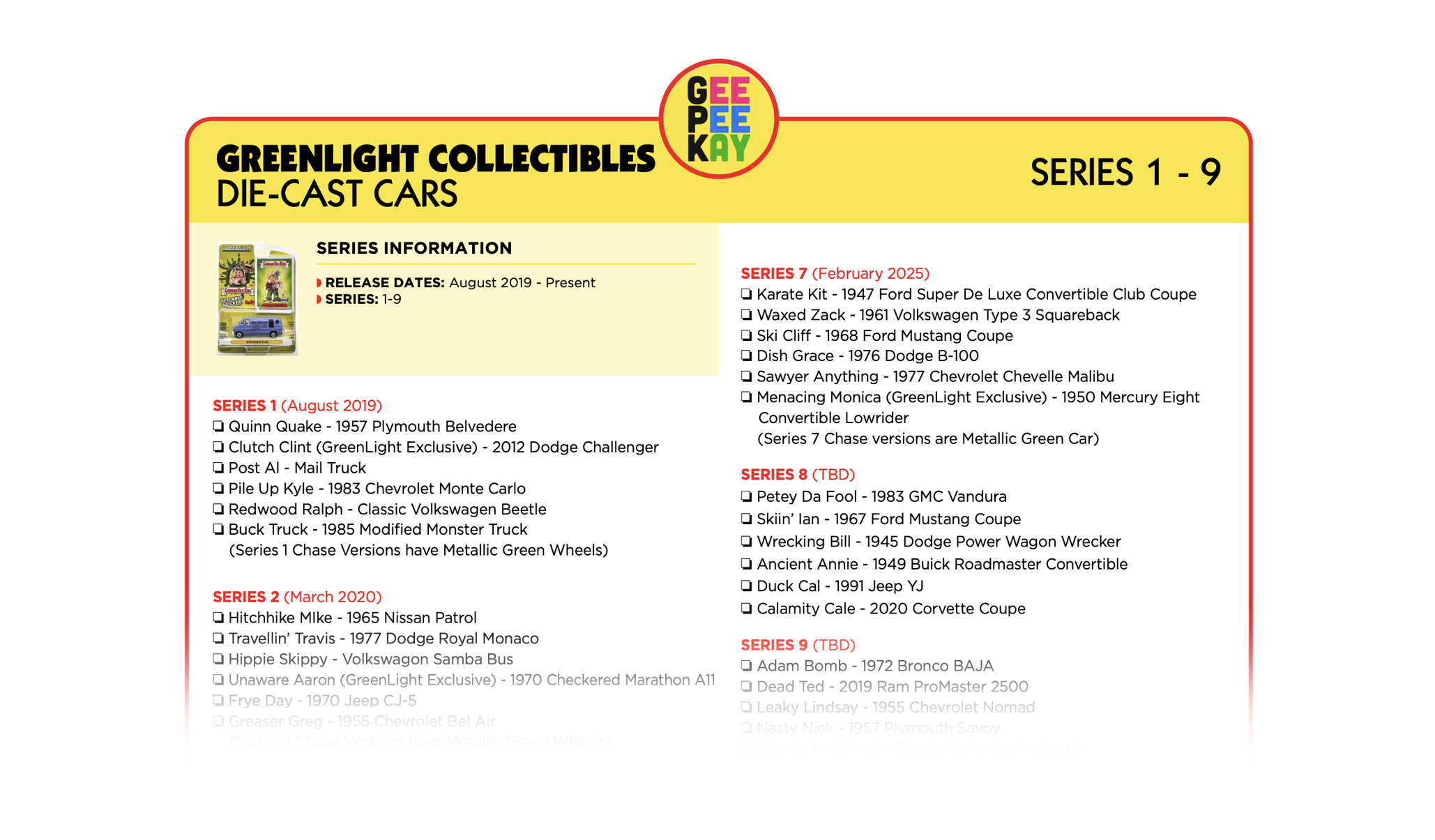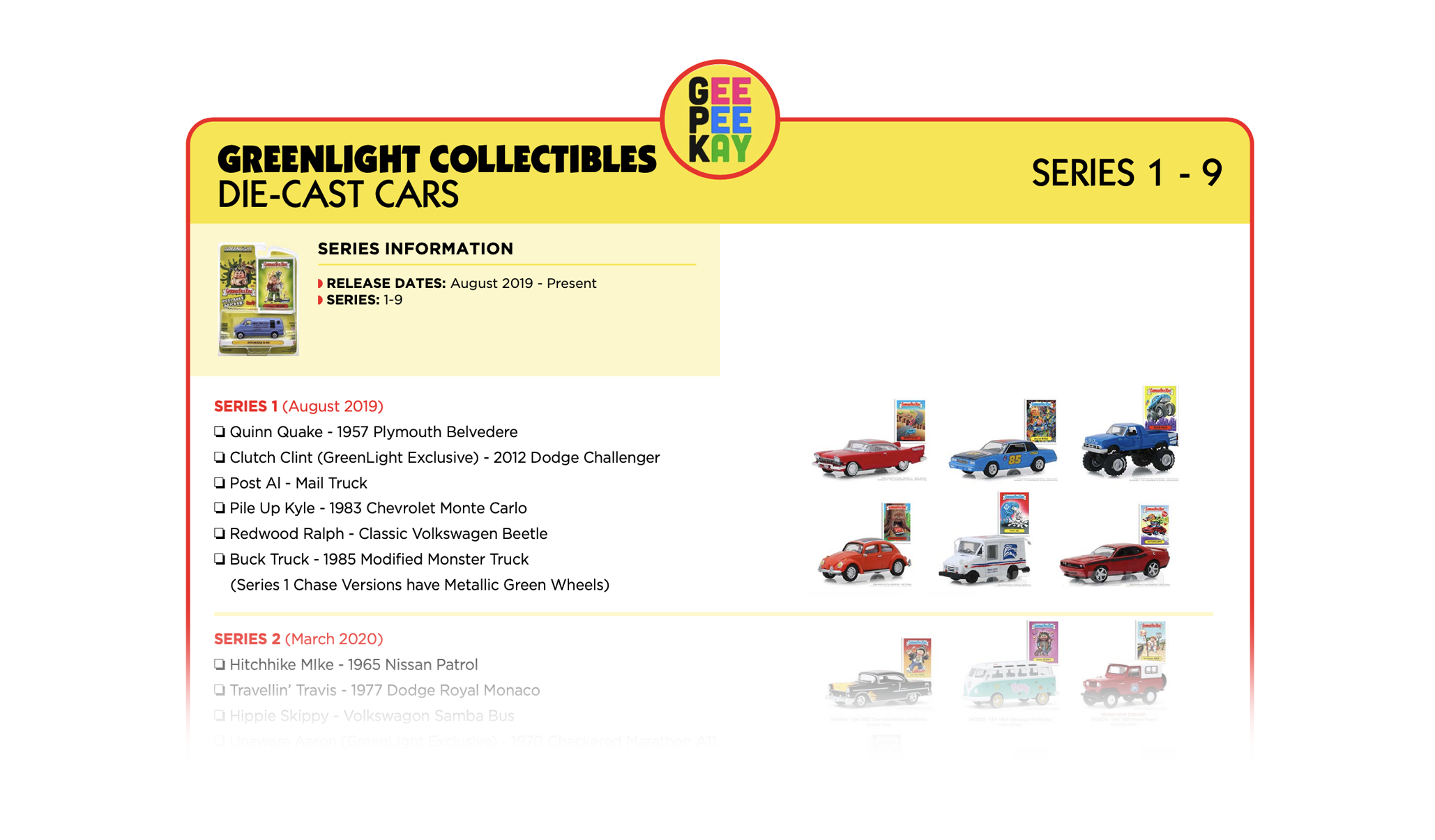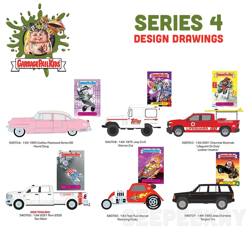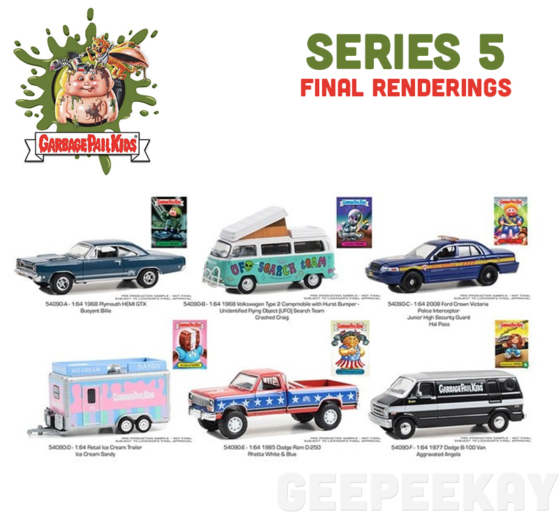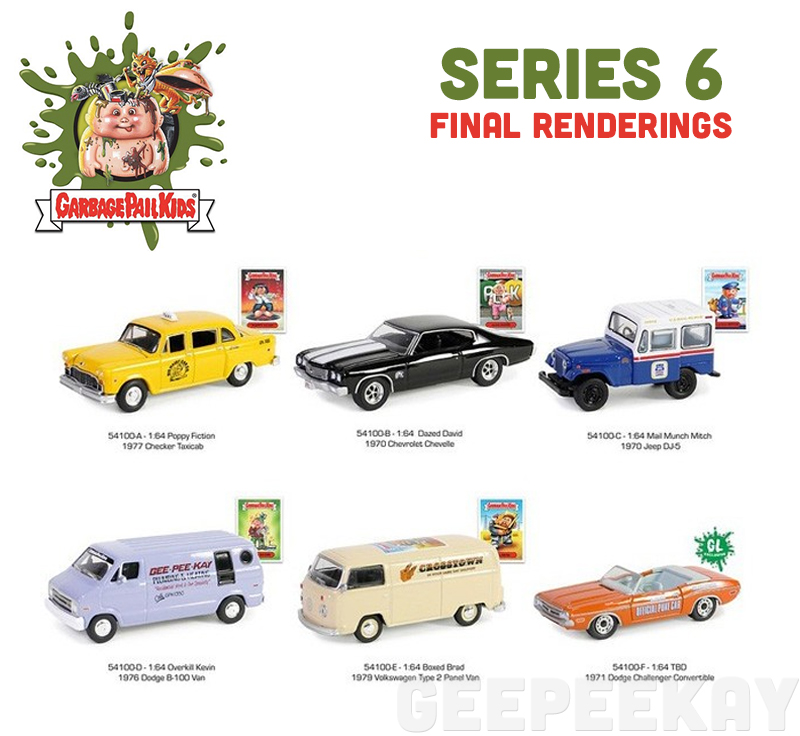 GreenLight shares detailed flat artwork for each series prior to their eventual release. These images are not fully-rendered final artwork, rather rough images designed to share the color patterns and overall design of the cars (and often a peek at the Garbage Pail Kids card accompanying each car)