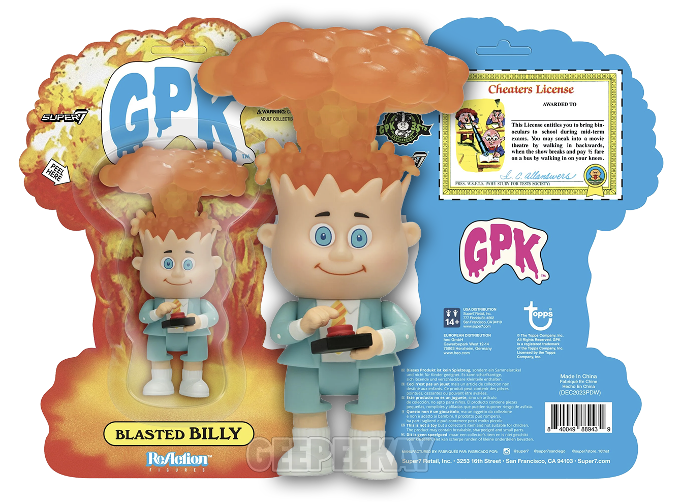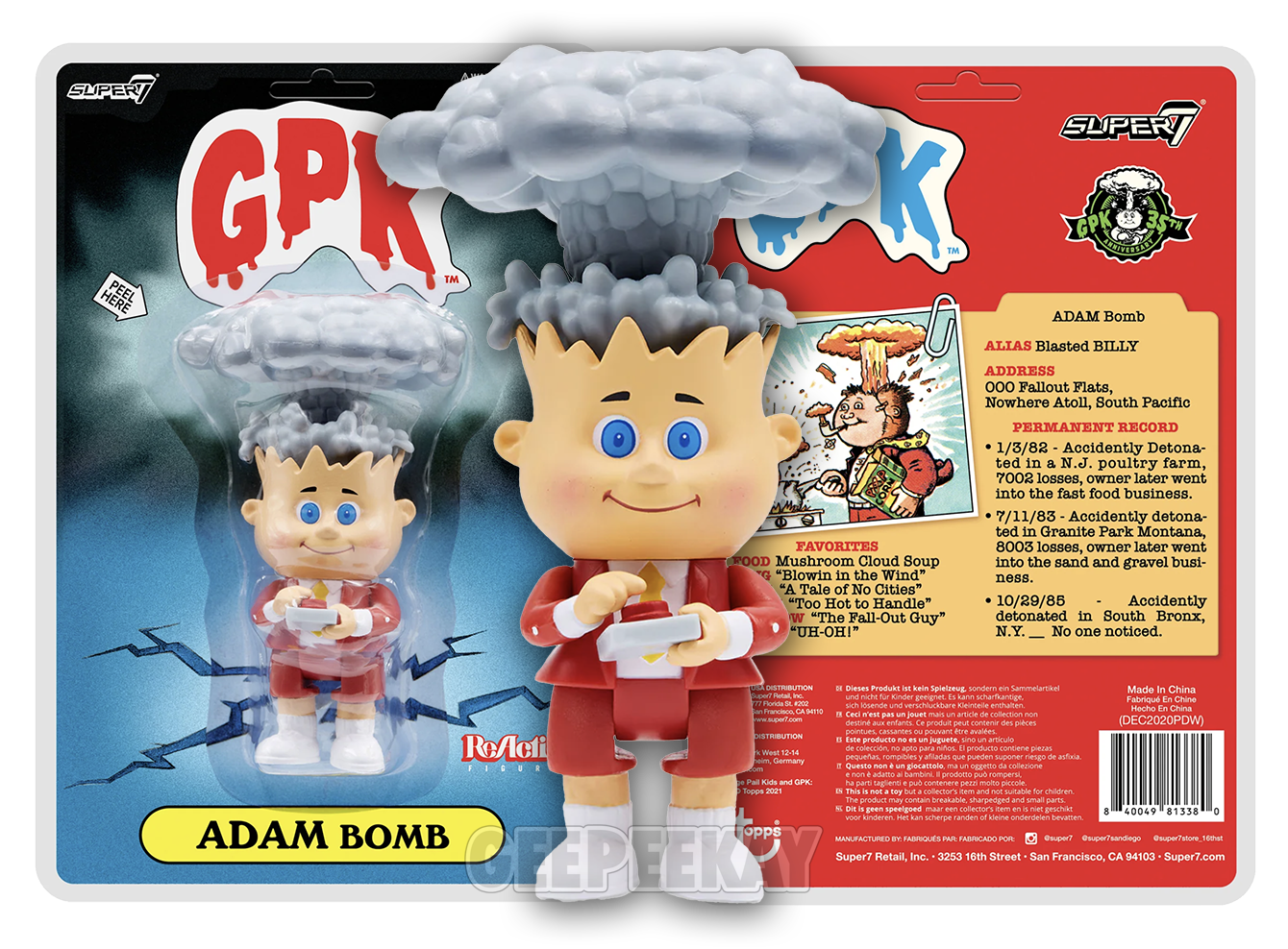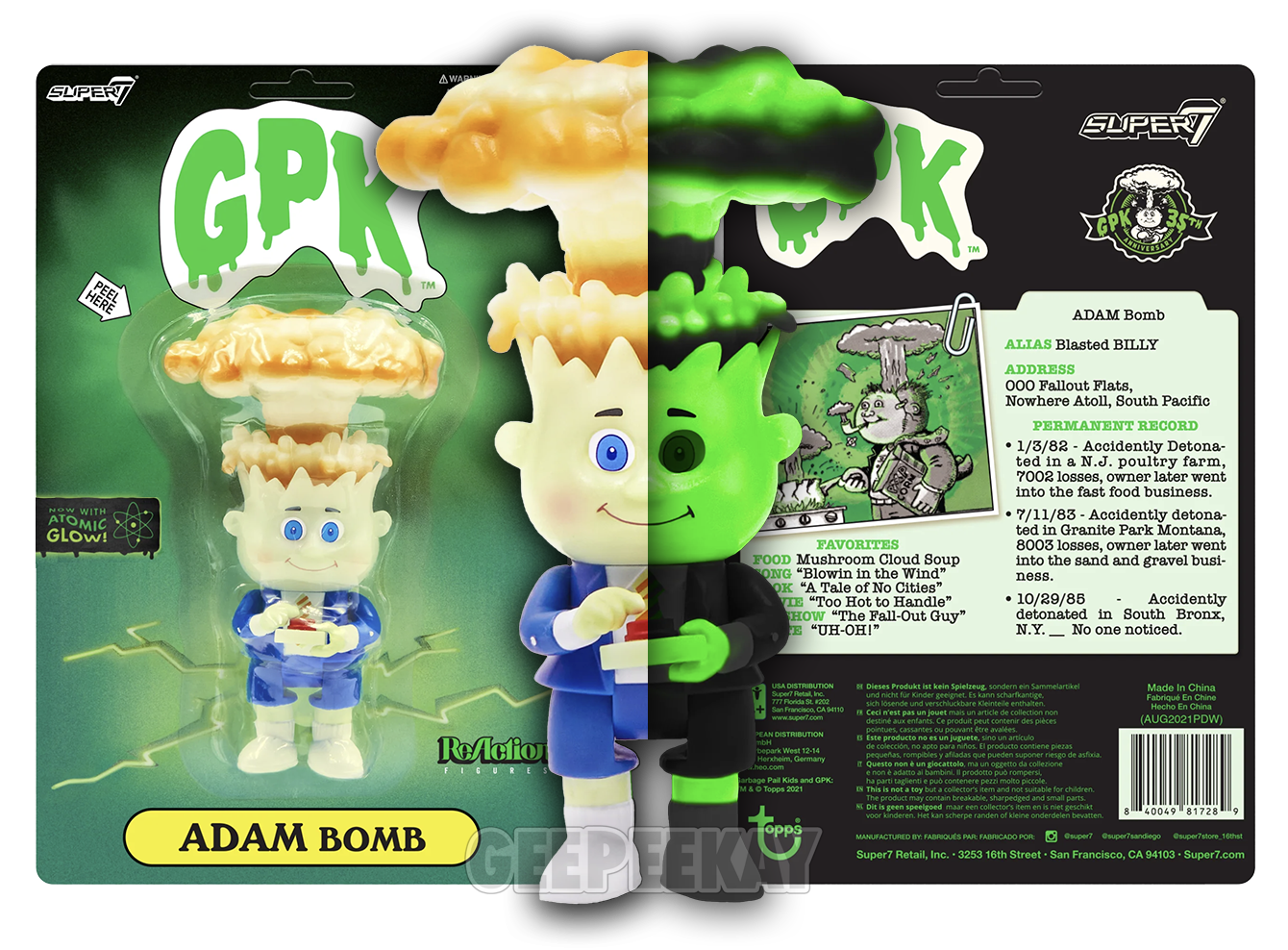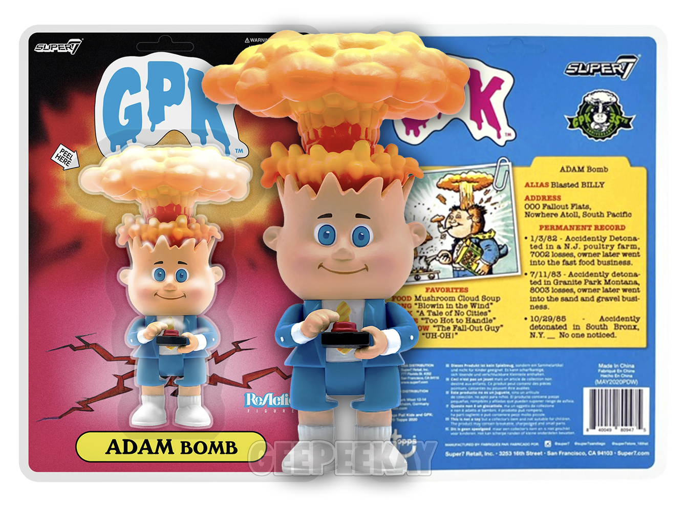 Back in 2020 Super7 released an Adam Bomb figure as part of their popular ReAction series. Standing at 3.75" tall, this figure features articulated arms and legs, and a button that can be placed in his hand. Packaging for the figure features a mockup of the 8a card artwork on the front, and original Garbage Pail Kids artwork on the back.