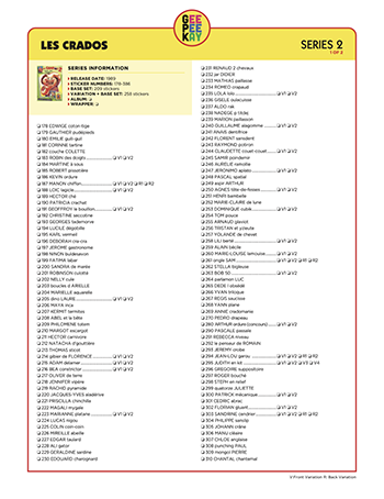 The main Les Crados releases were Series 1 (1988), Gum Wrappers (1989), Series 2 (1989), and All New Series (2004). Below are examples of stickers from the France Garbage Pail Kids releases:
