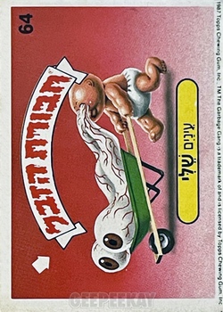 Lastly, a series of POGS have been located by collectors that appear to be loosely tied into the Garbage Pail Kids artwork. While a number of different examples exist, there are only a few that have characters displaying GPK-styled-children. I have included an example below.