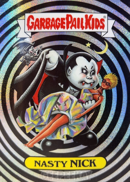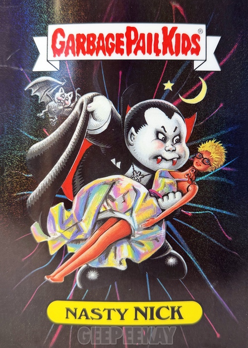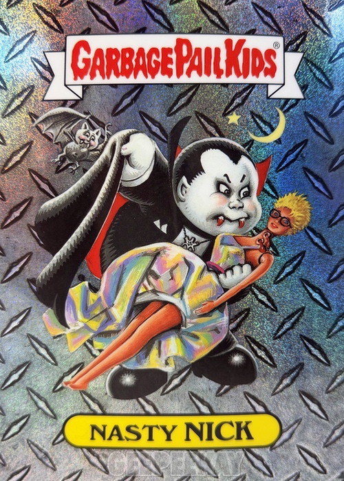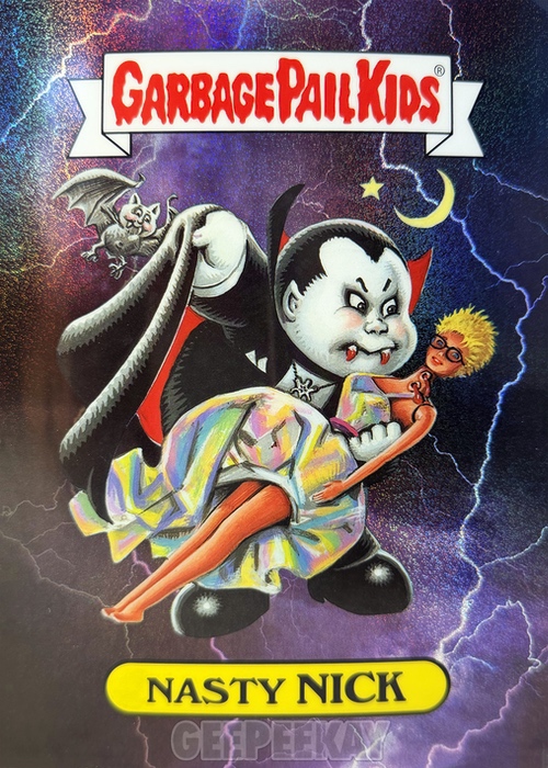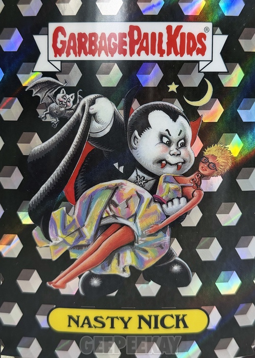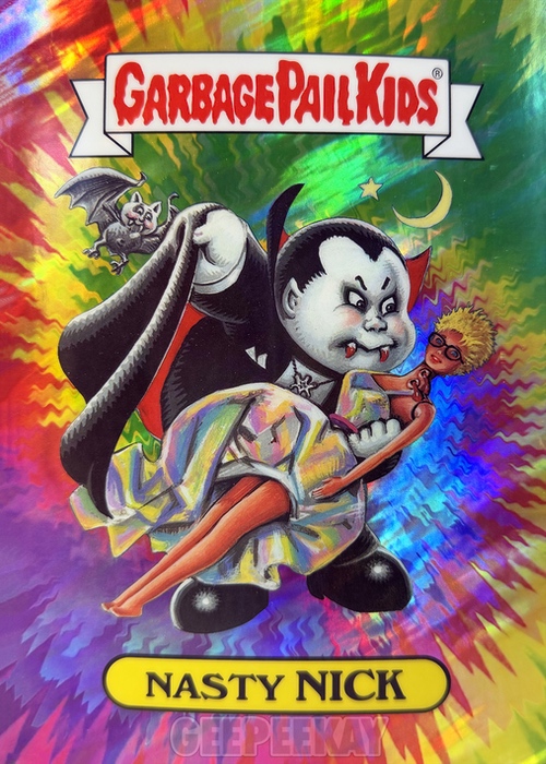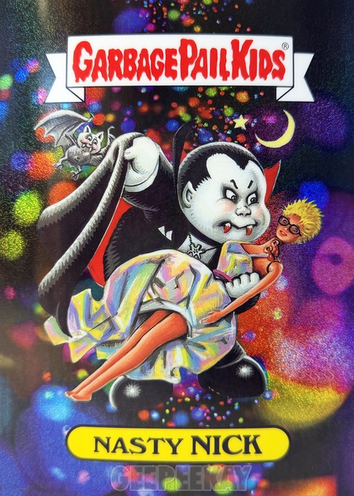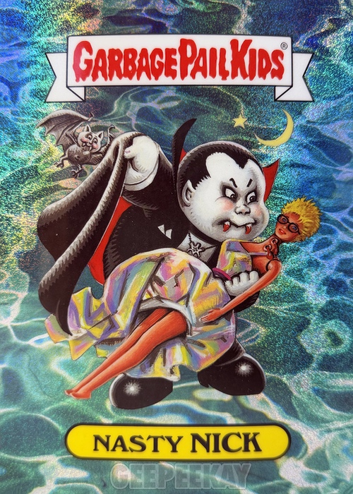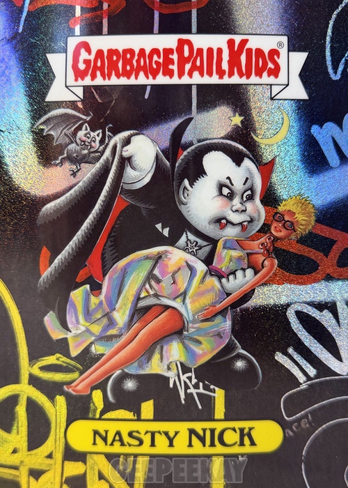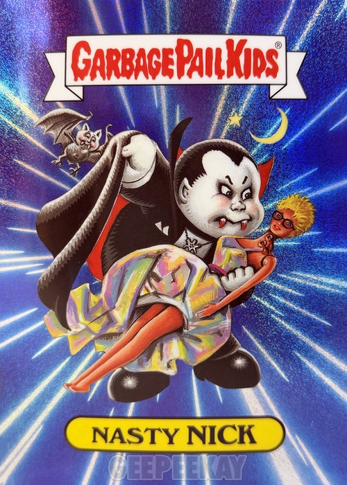 'Background' refers to the unique background image behind the character on the Art Print. Some of these backgrounds are contained in the main release as a Chase Variant, but others are unique to the Mystery Foil Prints. Below is a gallery of Nasty Nick prints highlighting the TEN different backgrounds out there to collect