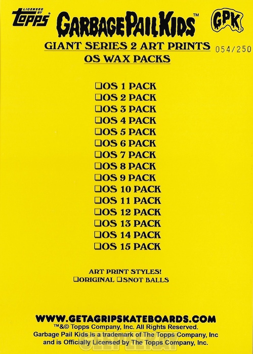 Each Wrapper Print is numbered out of 250, and there is a super-chase variation 'Snot Ball OS Wax Packs' variant for each Series that is numbered 1:1. Below is a Gallery of a few different 'standard' Wrapper Prints