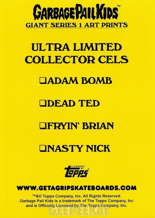 For Series 1 there were four Cel Art Prints to collect: Adam Bomb, Dead Ted, Fryin' Brian, Nasty Nick. These were randomly inserted with each box order, and collectors who purchased a case were guaranteed a complete set of four. Below is a Gallery showing an example of a Collector Cel Art Print