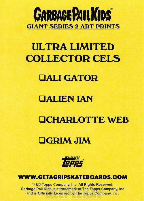 For Series 2 there were four Cel Art Prints to collect: Ali Gator, Alien Ian, Charlotte Web, Grim Jim. These were randomly inserted with each box order, and collectors who purchased a case were guaranteed a complete set of four. Below is a Gallery showing an example of a Collector Cel Art Print