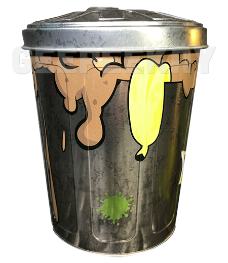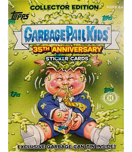 INFORMATION: For the 35th Anniversary release Topps created entirely new packaging for the Collector's Edition boxes: miniature GPK Garbage Bins. Made of metal these garbage bins featured a twist on/off lid, and stand approx. 5 1/2" tall. In a fun twist for collectors Topps released an alternate (chase) version of the tins that had 'Dave Was Here' written on the back of the bin. The metal bins were available 1 per Collector's Edition box
