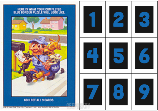 The completed Blue Border Puzzle from All New Series 5 (above) is shown on the back of cards 5b Runny Ryan, 34b Molly Pop. To complete the Blue Border Puzzle you will need the following nine cards: