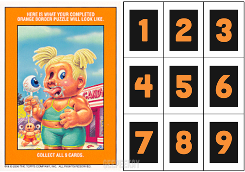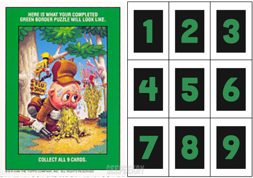The completed Green Border Puzzle from All New Series 5 (above) is shown on the back of cards 15a Armless Aaron, 28b Ty Kwon Don't. To complete the Green Border Puzzle you will need the following nine cards: