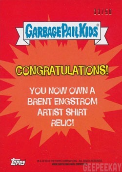 - INFORMATION: The above gallery displays samples of the various Artist Shirt Relic cards for the Trashy TV set. This page is intended to serve as an example of what an Artist Relic looks like to help collectors and their collections. There are a total of 4 artists who donated shirts for the cards, and they were limited to 50 of each artist. The cards were found in 1:175 Collector's Edition packs