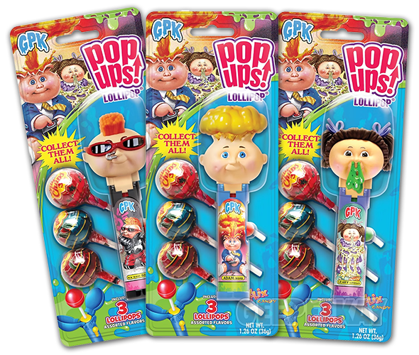 In a fun surprise that no one saw coming, Flix Candy released three Garbage Pail Kids POP UPS! in late-2023. The heads of Adam Bomb, Graffiti Petey, and Leaky Lindsay sit atop a plastic holder, and when a button is pressed the head splits open to reveal a Chupa Chups lollipop. These were available both loose, and on blister pack (pictured)